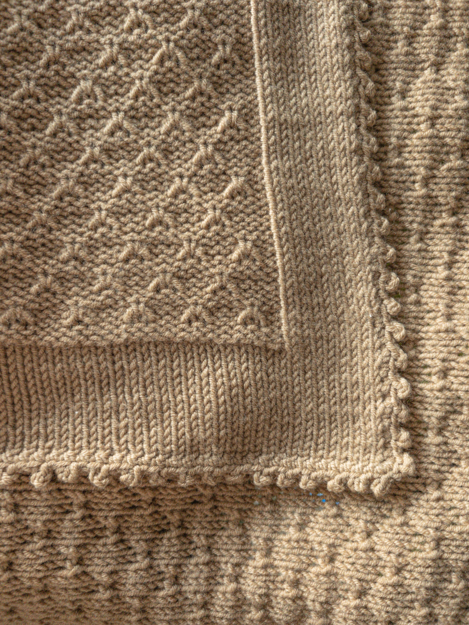 Dette teppet strikkes frem og tilbake i en vakkert strukturert mønster som skaper et luksuriøst, men luftig stoff perfekt for de små. Kantene har en delikat heklet picotkant som tilfører designet et elegant preg.