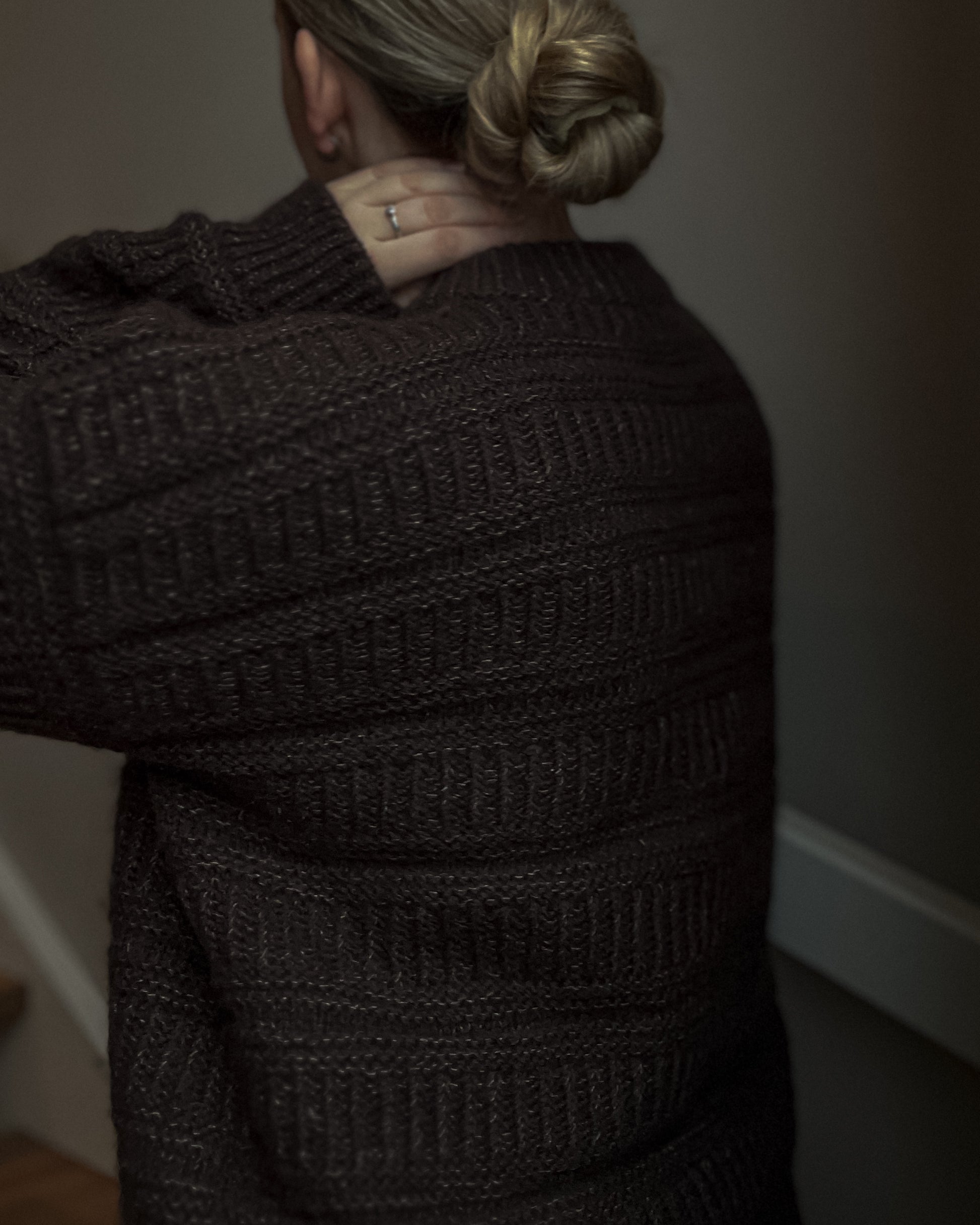 Oppskrift på genser strikket ovenfra og ned i en meditativ og avhengighetsskapende struktur.
